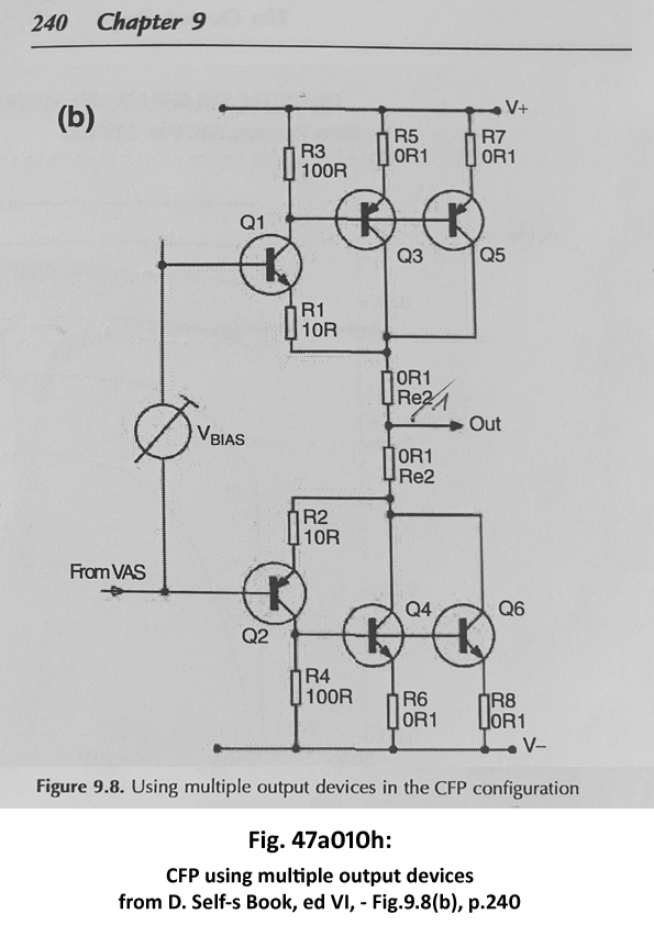 „… A typical design would employ a 100 Ohms resistor in the emitter of the drivers (in D. Self’s book these resistors are R1 = R2 = 10 Ohms), for the drivers Q1, Q2 – master/gain transistors – Fig. 9.8(b), p. 240), sl. 47a010h. (slika iznad teksta), and a resistors of the same value as Re, in the emitters of the output/slave transistors in CFP (like Re1 = R5, R7 = 0.1 Ohms and Re2 = R6, R8 = 0.1 Ohms as in Fig 9.8(b), p. 240, in D. Self’s book, odnosno 47a010h. (slika iznad teksta). The use of parallelled output (slave) transistors requires degeneration of the CFP output transistors anyway.“