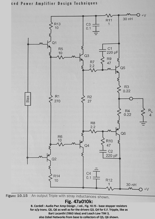 - BASE-STOPPER otpornici (R5, R6 = 10 Ohms), dodaju se na bazu svakog drajver tranzistora kod TRIPLE E.F. konfiguracije (predriver, driver, output trans. – Konfuguracija Bart Lochanthi (1960) ili Leach Low TIM 3). Videti o tome u Cordell-ovoj knjizi na strani 208, Fig. 10.15, tj. sl. 47a010k.: